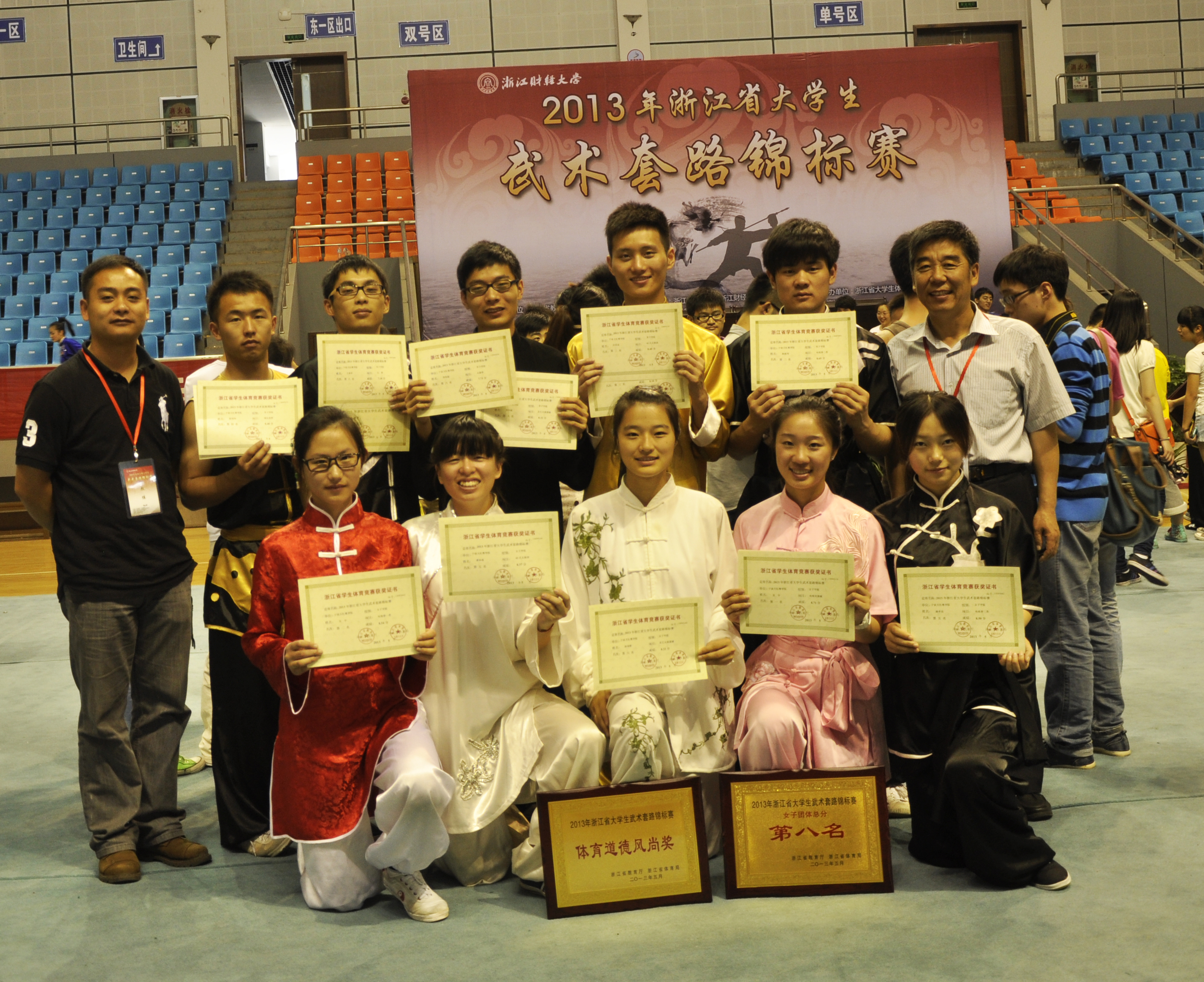 5月16—19日, 2013年浙江省大学生武术套路锦标赛在浙江财经大学举行,经过激烈比赛,我校由贾鹏飞老师为领队、何青山老师为教练的武术队表现突出,获得了多个奖项:吴宇同学荣获女子双剑第一名;杨振闯同学荣获男子通臂拳第二名;应星辰同学荣获男子42式太极拳、42式太极剑第三名;陈琛钧获男子南拳第四名、传统单器械第八名;潘如意、潘孝花同学分别获得女子42式太极剑、女子传统拳第五名;周洲、周伟健、林琦静同学分别获得女子南拳、男子自选太极拳、太极器械、女子太极器械第六名;王喜洋同学获得男子自选长拳第八名。同时,女子组还获得团体第八名。此外,周伟健同学被评为2013年浙江省大学生武术套路锦标赛“体育道德风尚奖运动员”,我校被评为体育“道德风尚奖”。
