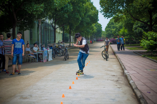 21日中午,在社团文化广场,各协会已经在指定位置张贴了海报、摆好了桌子和音响等设备。各社团可谓争奇斗艳,各显神通。红鹰TV社的汉字英雄游戏、诸神黄昏动漫社的捞金鱼比赛、棋奕协会的“真人飞行棋”、美食协会与DIY协会的美食DIY、广角摄影协会的“抢镜王”游戏、心理协会的心理健康测试、创新协会的“一站到底”等,无一不让同学们争相围观。除文艺、游戏表演外,轮滑协会的花样轮滑、街舞协会的即兴表演、排球协会的球技展示、羽毛球协会的双人对打等也纷纷上阵,赚足了同学们的眼球。整个现场呈现出一派百花争艳的热闹景象。