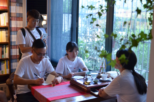 面对我们的到来,娜姐非常热情,亲自泡制了红茶,招呼大家就坐。一落座,同学们就和娜姐围绕着书店名字的由来、电商对实体书店的冲击、书店今后的发展等问题聊了起来。书店是刘晓娜从自己姐姐手里接管下来的,创办于1989年,到现在已有27个年头。“起初,书店名叫热门书店,这还是台湾著名作家三毛取名的。”2010年前后,由于受到各方面因素的影响,书店遭遇了危机,连续亏损。“说真的,我曾想过放弃。但是在我最困难的时候,书友们站了出来,在精神和物质上都给予了强有力的支持,我重燃了心中的信念。后来通过加盟经营、政府财政补助,书店才得以延续至今。”如今,书店主要经营人文社科、教育类书籍,常年在架图书3万多册,拥有7000余名固定会员,2015年图书销售额突破80万元。