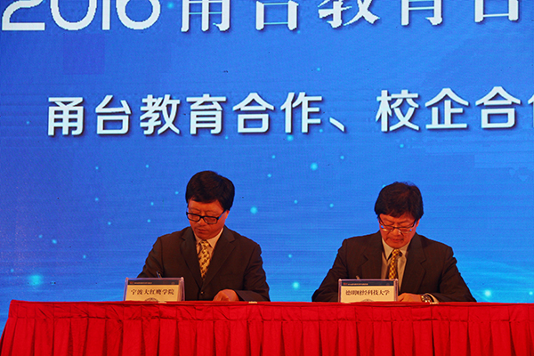 9月23日,由宁波市人民政府主办,市教育局、市政府台湾事务办公室承办的“2016甬台教育合作交流会”在宁波举行。会上,我校与台湾德明财经科技大学达成初步合作意向,校长助理高振强、台湾德明财经科技大学副校长翁顺裕出席仪式并代表两校签署了合作协议。根据协议,两校将在教学、科研、师生交流、共同举办学术活动等方面展开交流与合作。