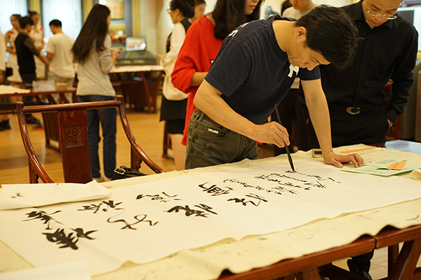 书画家们的作品受到了在场师生的喜爱和欢迎,他们的精湛技艺更是让到场的师生赞叹不已。“粉丝”里三层外三层翘首观赏,有不少学生举着相机记录下这难忘一刻。来自信息工程学院的书画爱好者陈洪同学说,“我是学网络工程的,平时除了关注计算机科学知识外,对中国传统书画也十分热爱。这次听说有书画名家来校献艺,所以早早就守候在这里,果然大开眼界!”