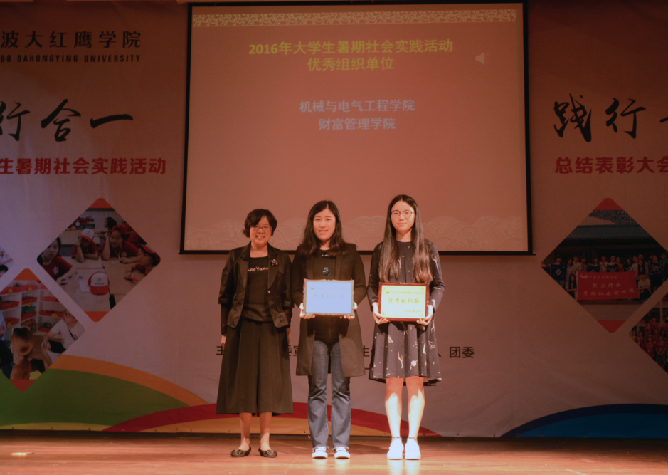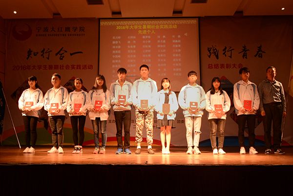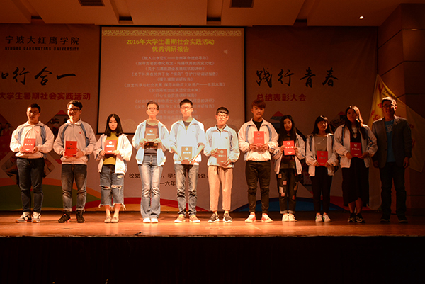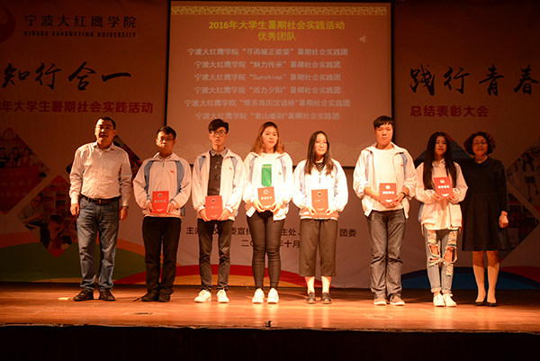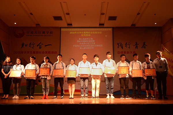 大会对暑期实践活动中表现突出的团队和个人进行了表彰。经评选,阮程鹏、王朝勋、舒朝阳等96位同学获得2016年大学生暑期社会实践活动“先进个人”称号;“魅力传承”暑期社会实践团、“寻甬城正能量”暑期社会实践团和“Sunshine”暑期社会实践团等12支实践团获“优秀团队”称号;《中华传统非物质文化遗产的传承与创新探析——以云南白族扎染技艺为例》、《社会人员对大学生支教的认识调研》、《关于外来务工父母对孩子学习情况的关注度调研》等23篇调研报告被评选为“优秀调研报告”;嘉兴市海宁市马桥街道先锋村、周巷镇清风小学、喜憨儿阳光驿站等11个基地被评选为“优秀基地”;方达、高姝佳、侯凤芝等17位老师获“优秀指导老师”;机械与电气工程学院团委、财富管理学院团委被评选为“优秀组织单位”。