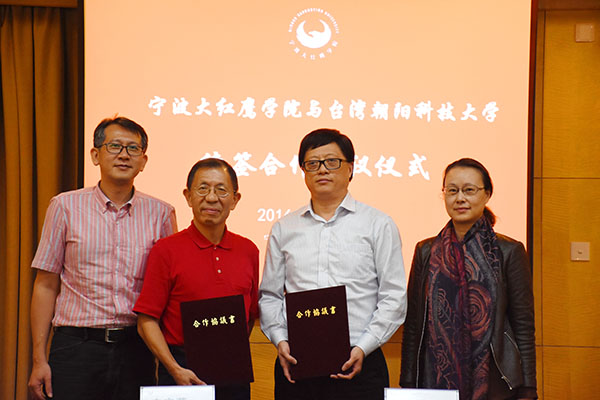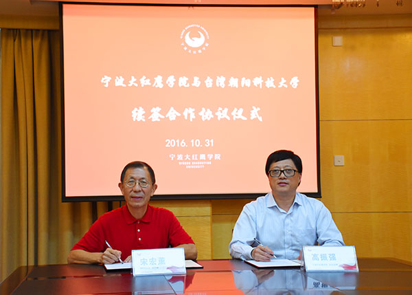 台湾朝阳科技大学校长助理宋宏薰(左一)和我校校长助理高振强(右一)分别代表双方签订合作协议