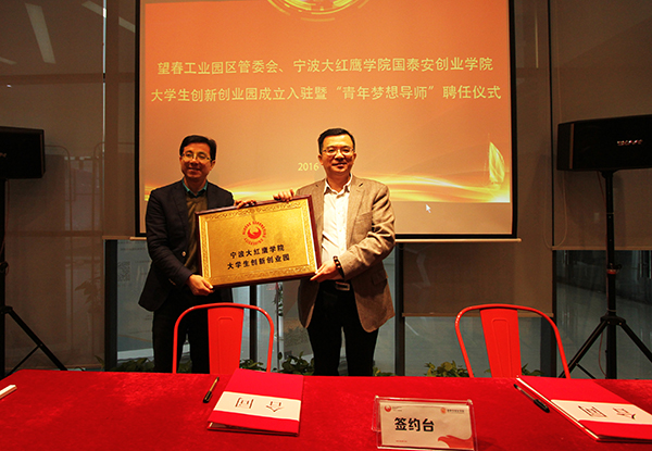 集士港镇工业镇长姚杰与宁波大红鹰学院国泰安创业学院执行院长秦焰冰签约授牌