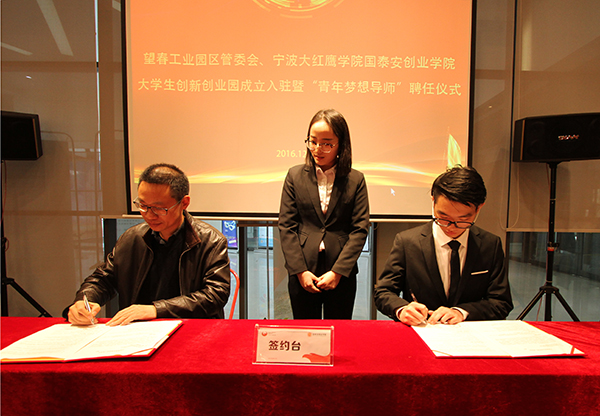 随后,我校学生社团青年梦想家创业协会会长陈豪特作为大学生创业者入驻代表与宁波望春工业园区望春科技创业中心水新国总经理签署入园协议。