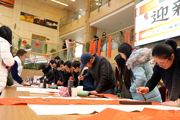 为喜迎新年,12月29日,我校在图书馆大厅举办了第三届“迎新春——师生共写春联”活动。