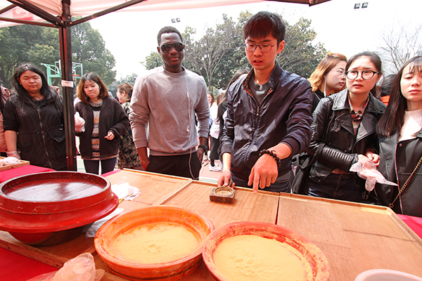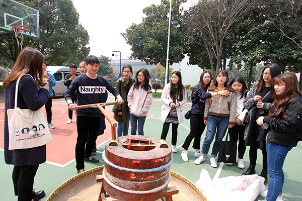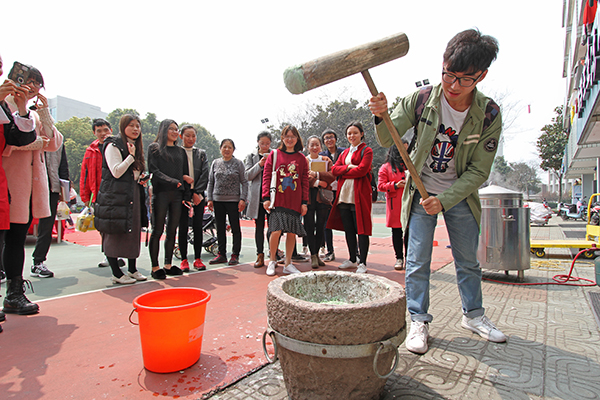 当天中午,“大学生生活体验馆”前人头攒动、欢声笑语。看到同学们围拢过来,周素珍便一一介绍起青团的制作工具,“这个是碾米的茏谷,这个是磨粉的石磨,那个是捣团的石拓,同学们不要小看这些看似‘笨拙’的制作工具,想要熟练地驾驭它们,除了足够大的力气,还需要一定的巧劲。”