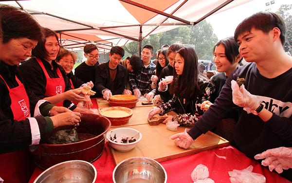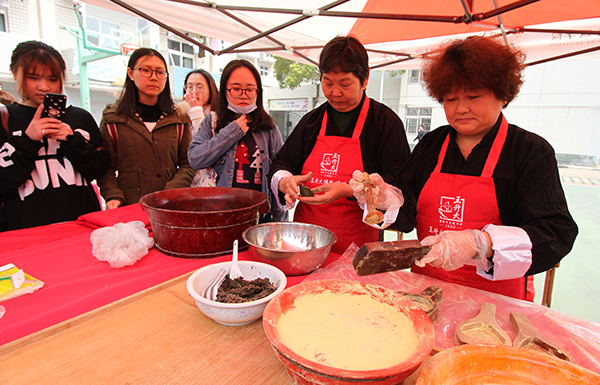 非遗传承人周素珍(右一)女士来校指导大学生做青团