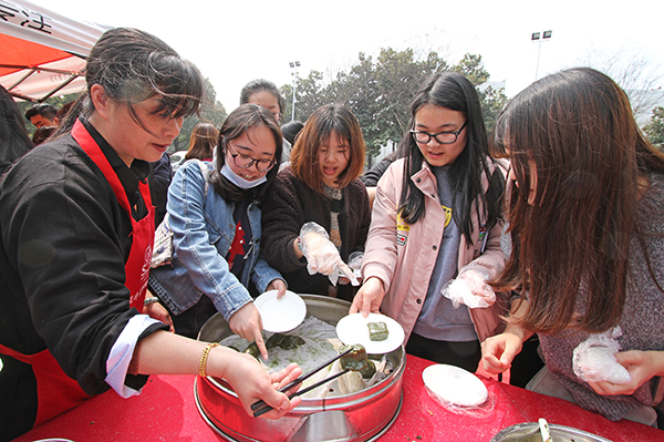 如果有朋友问你,“清明时节宁波有什么好吃的?”老底子宁波人肯定会脱口而出:“黑饭麻糍青雪团。”3月29日,王升大博物馆的“非遗”传承人周素珍女士不仅把这几样传统美食带进了我校校园,同时还手把手地给大学生们传授青团制作技艺。