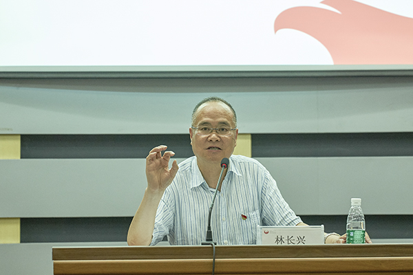 随后,林长兴为全体参会人员上了一堂题为“牢固树立党的一切工作到支部的鲜明导向 扎实推进“两学一做”学习教育常态化制度化工作”的专题党课。他从“学好文件抓住纲,纲举目张心中明”、“落细落小落实,真抓实干夯基础”、“积极探索学校党建工作新理念、新模式、新要求、新机制、创出新成效”等三个方面,对我校“两学一做”学习教育常态化制度化工作作了全面解读和工作布置。他要求,全校上下要统一思想,提高认识;明确“两学一做”学习教育常态化制度化工作的主要内涵;清晰认识“两学一做”学习教育的三个导向以及新时期“两学一做”学习教育的三个定位。他强调,“学”要入脑入心,“做”要落细落小,“改”要动真碰硬。各级党组织和党员要牢固树立“四个意识”、自觉践行五大发展理念,在日常工作中坚持“围绕中心抓党建,抓好党建促中心,评价党建看中心”的工作理念,深化“一核四驱动”的工作模式,将“两学一做”落细落小落实,推进学习教育活动常态化制度化。
