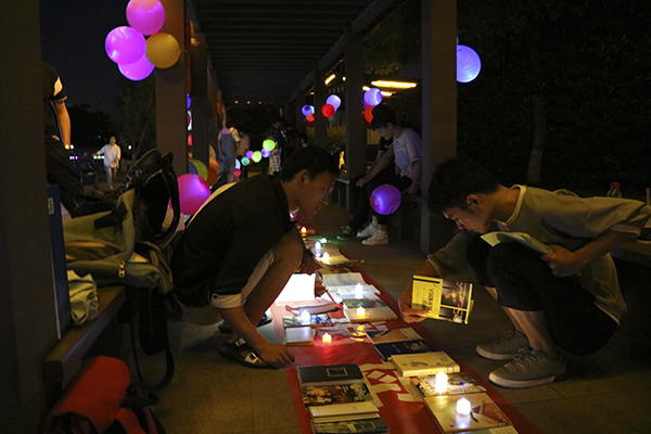 夜幕降临,换书大会在精彩的文艺表演中拉开序幕,动感街舞同盛唐夜舞“争奇斗艳”,古筝演奏与流行歌曲“琴瑟和鸣”,互动游戏令人“笑语连连”。随后进入了换书环节,《林思·妙语》清新明丽、隽永悠长,《宁波老味道》散发着浓油赤酱的美妙滋味,《阿拉宁波话》尽都是吴侬软语,《乡愁》用丰富的视觉资料展现濒临消失的古村民居风貌……书海中泛起的点点微光与青春面庞相映,百余名师生因书结缘,交换着彼此珍爱的图书。