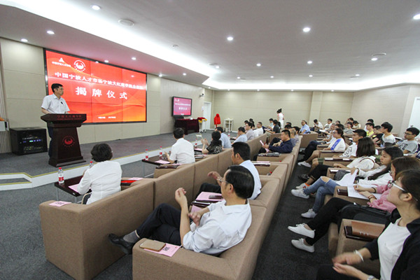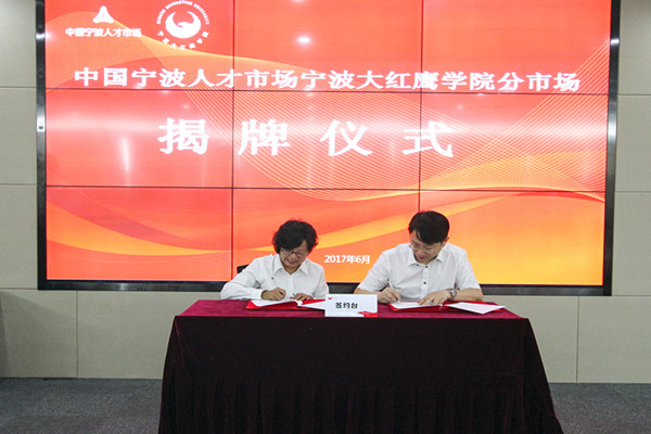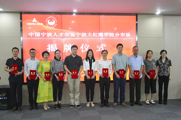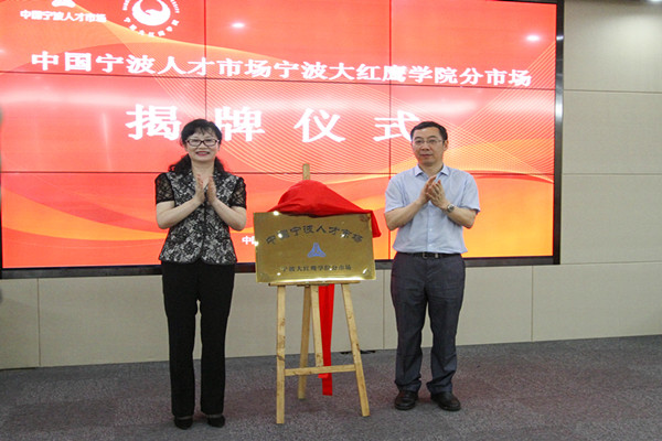 孙惠敏与林惠明共同为宁波大红鹰学院分市场揭牌,她还代表学校向10位职业生涯规划导师颁发聘书。校长助理何秋叶与市人才服务中心主任徐承志代表合作方就共建分市场签约。