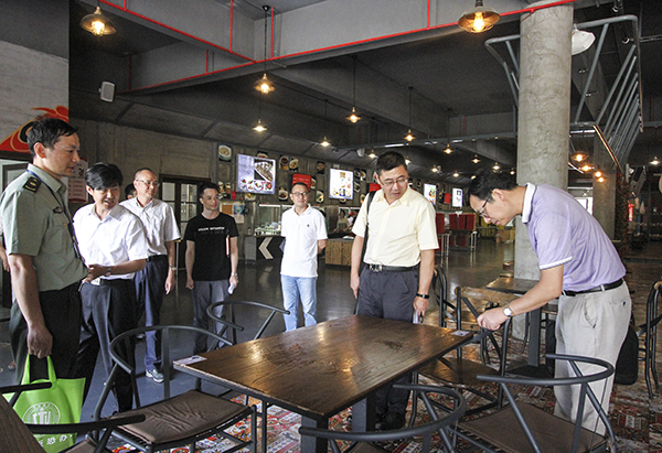 孙剑鸣一行深入食堂、学生公寓、图书馆、军训场地、文化长廊、校园主干道等地,通过校园环境巡查、查阅资料、现场查看、实地抽查等方式,对我校文明创建氛围营造、阵地建设、环境卫生、消防安全等方面工作进行了细致检查。