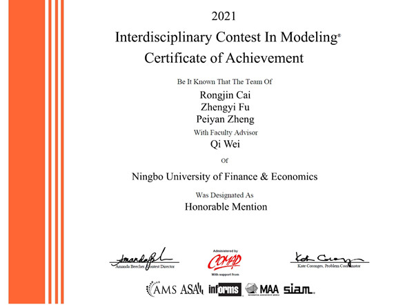 日前,从美国(国际)大学生数学建模竞赛组委会传来喜讯,由我校吴用、魏麒、王聚丰、朱凤梅等老师指导,蔡溶瑾、傅郑一、郑佩艳团队,郑钦喜、俞泽峥、周文俊团队,陈炜峰、薛桢桢、陈锎红团队以及陈沛琦、王俊杰、叶灵微团队均获得2021年美国(国际)大学生数学建模竞赛(MCM/ICM)国际二等奖。这也是我校学子在该项赛事上连续第三次获奖。