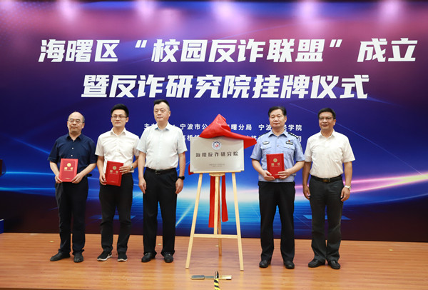 为更好的实施精准反诈,7月15日下午,海曙区“校园反诈联盟”成立暨反诈研究院挂牌仪式活动在我校举行。海曙区副区长、公安分局局长宣业靖,校党委书记周波等领导,市委政法委、市公安局、市教育局、区委政法委、区公安分局、区教育局、区司法局、高桥镇、海曙移动公司等单位以及反诈研究院成员、“校园反诈联盟”志愿者参加活动。